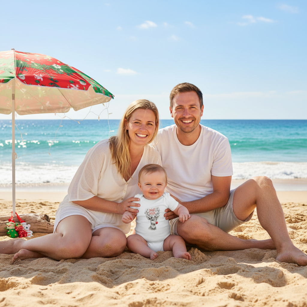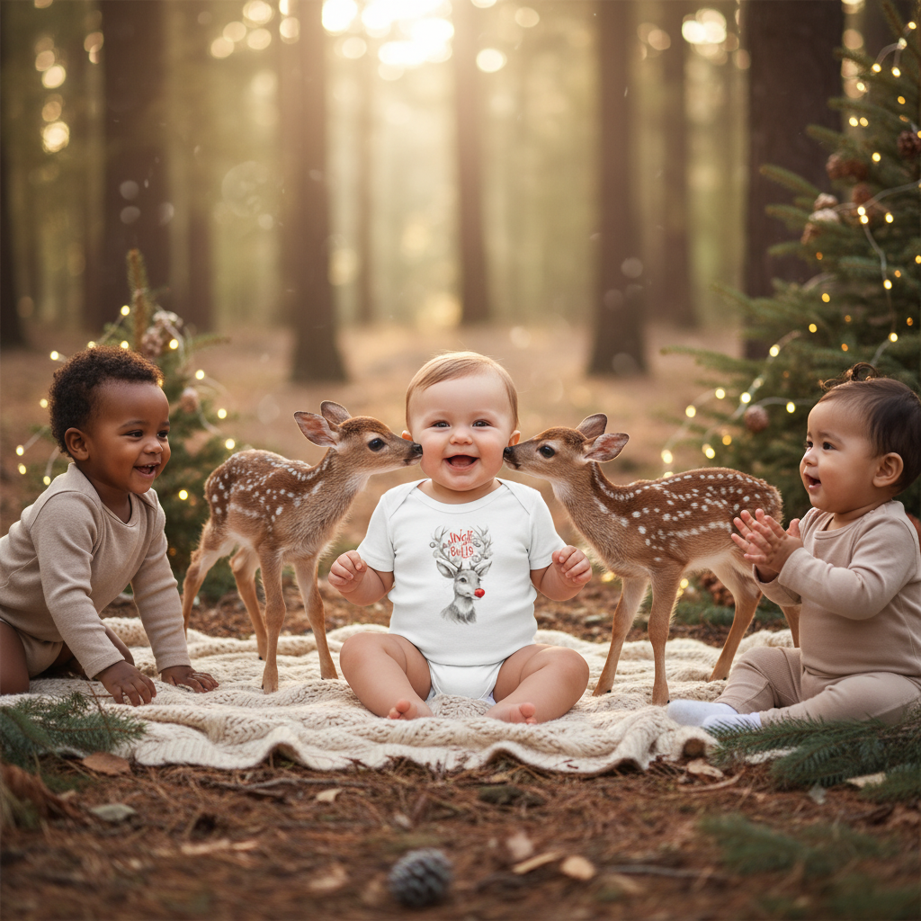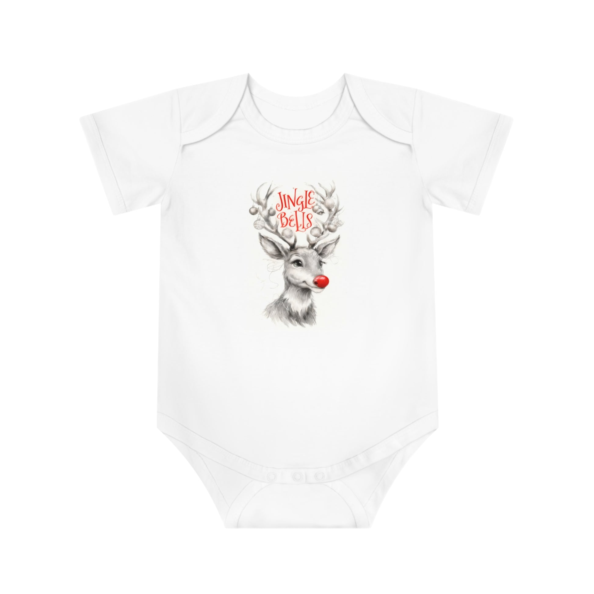 Soft, light, and snug — this baby bodysuit brings holiday whimsy to everyday wear. A gentle reindeer illustration with a bright red nose and festive "Jingle Bells" lettering sits over the chest, creating a sweet focal point without overwhelming tiny proportions. The envelope neckline and snap bottom make dressing and changing quick and calm. Breathable cotton with a hint of stretch keeps movements easy while the double-stitched seams hold up to washes and play. Subtle, tear-away labeling keeps skin happy. Let this bodysuit be the little layer that adds warmth and cheer to family gatherings, photo moments, or cozy mornings at home.