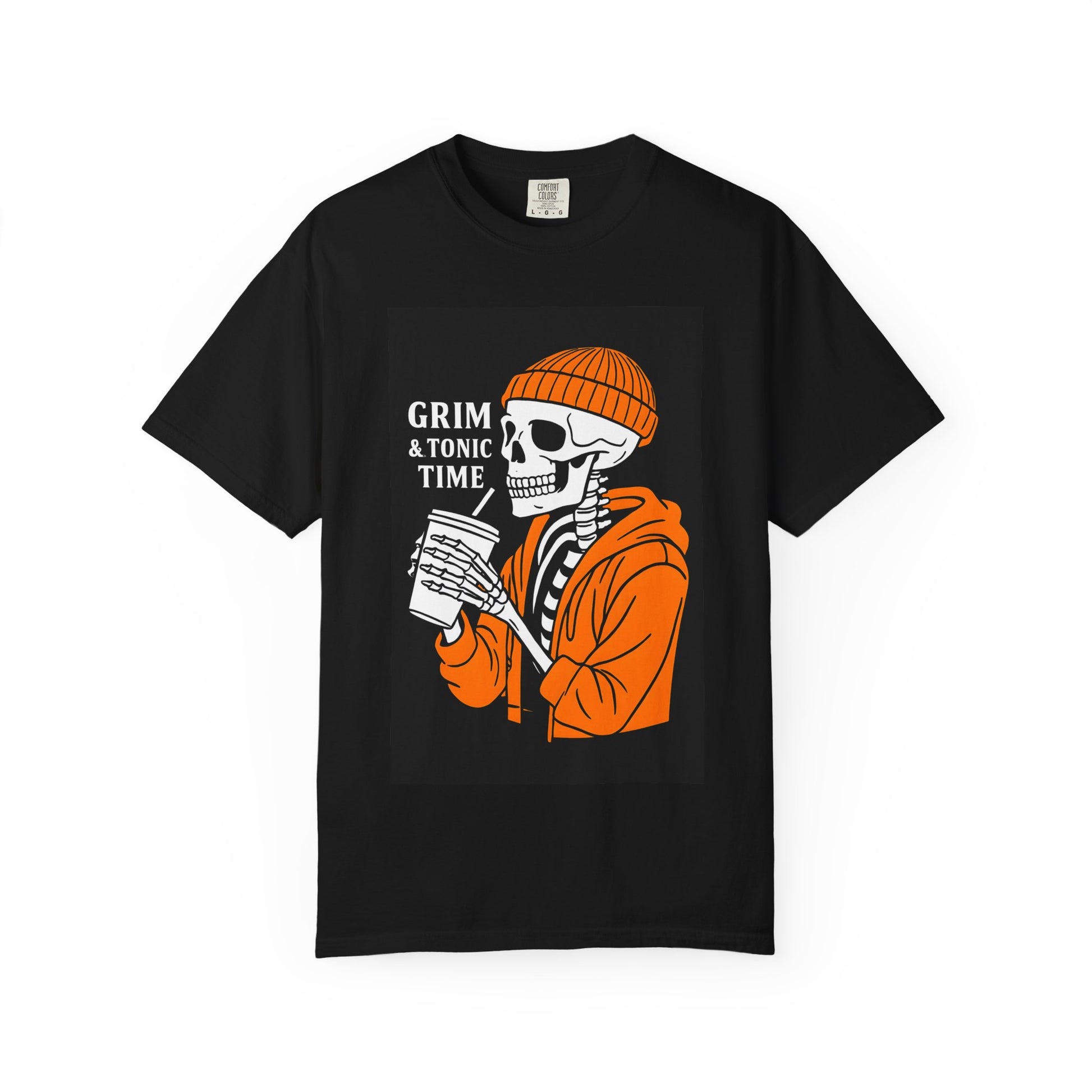 Grim A Tonic Time Skeleton Black T-Shirt, Unisex Graphic Tee, Halloween Apparel, Casual Style, Perfect for Spooky Season, Gift for Horror Fans