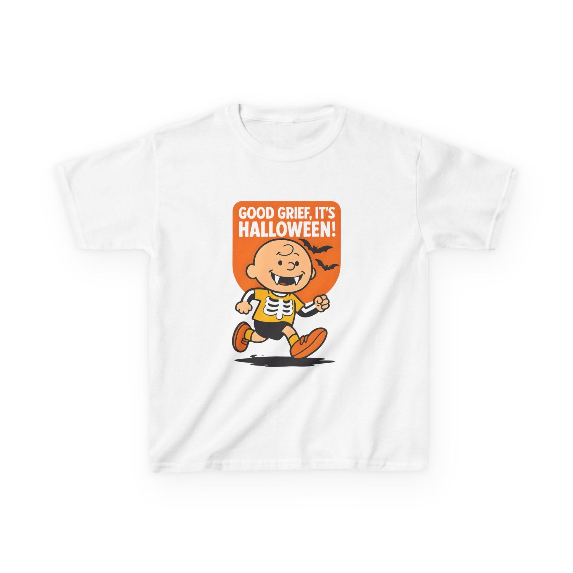 Celebrate Halloween with this fun and spooky Kids Heavy Cotton T-shirt featuring a 'Good Grief its Halloween Charlie' design. Perfect for young trick-or-treaters looking to embrace the Halloween spirit.