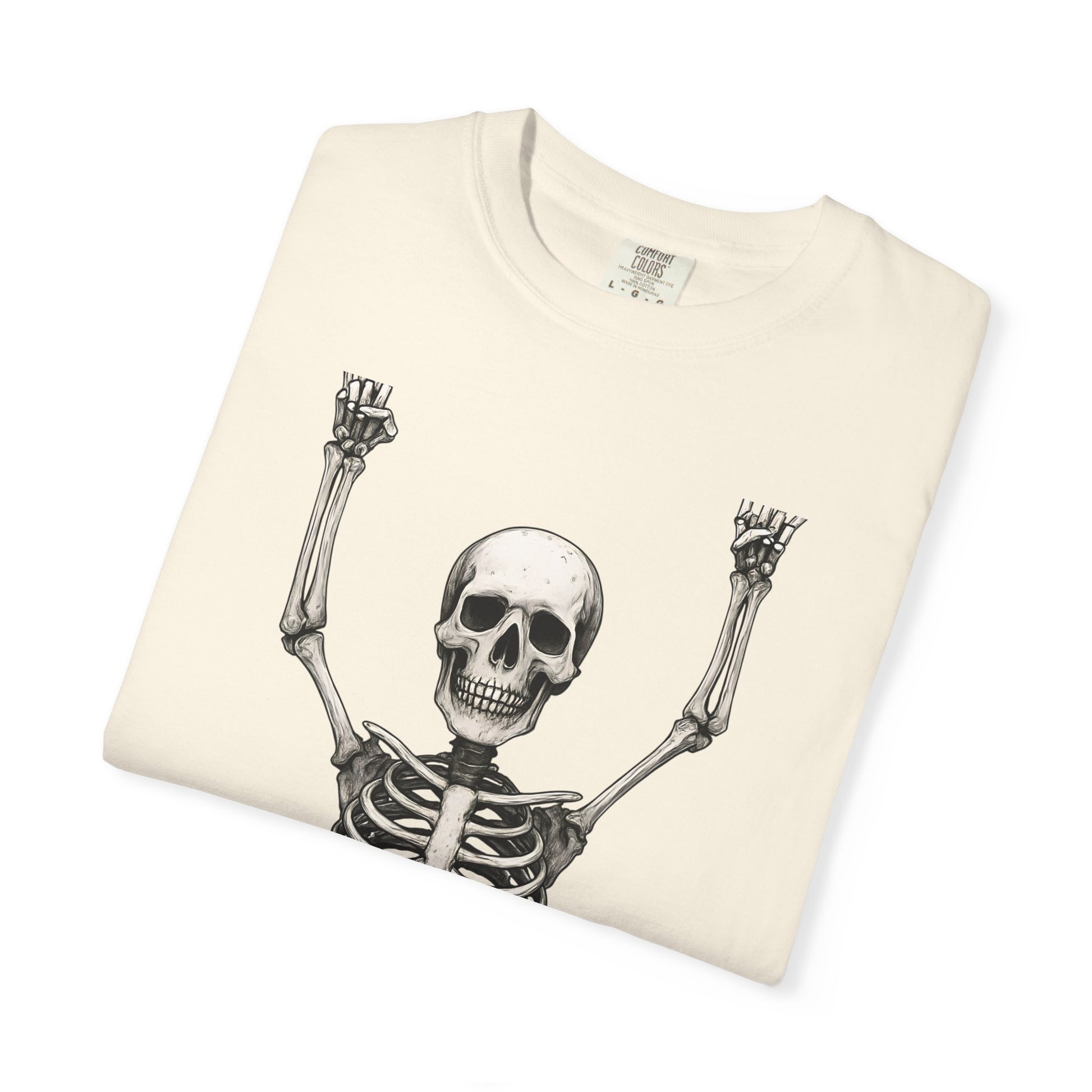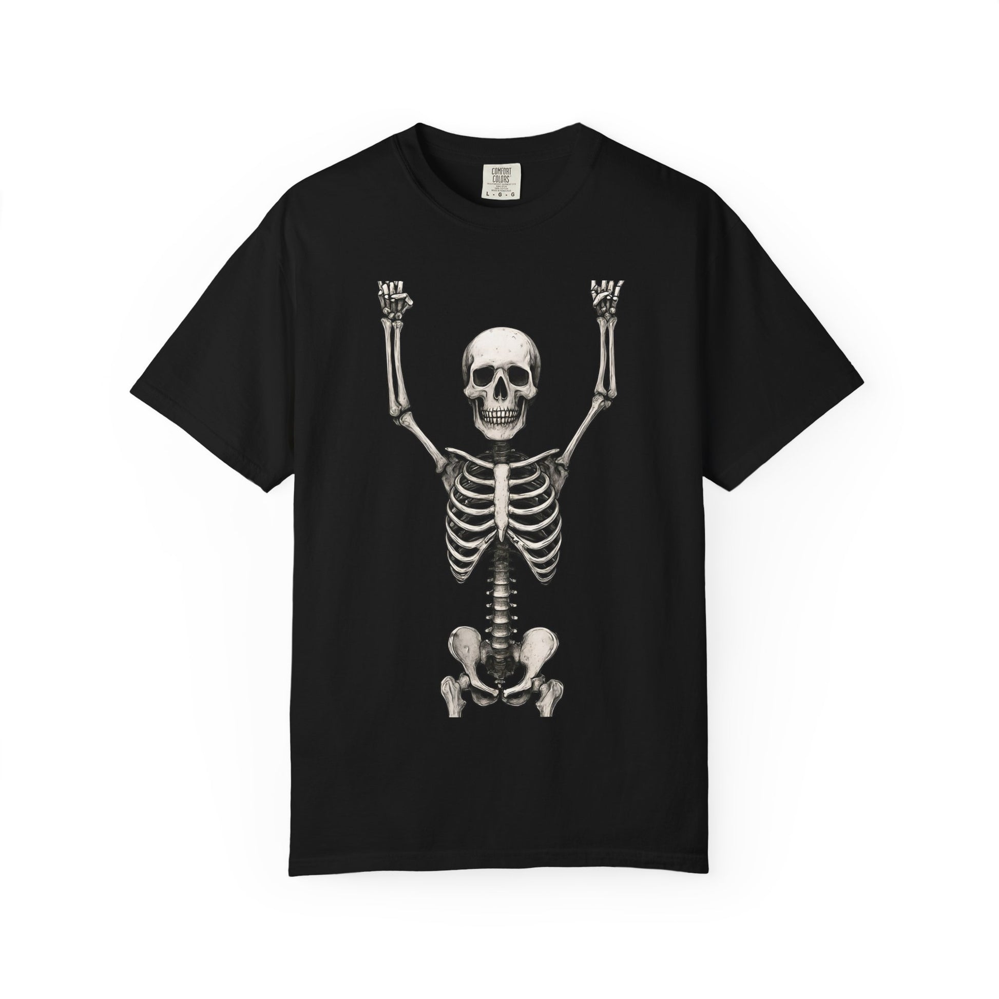 Hands Up Skeleton Graphic T-shirt, Unisex Vintage Tee for Halloween, Casual Wear, Skeleton Art, Gift for Spooky Lovers, Festival Apparel