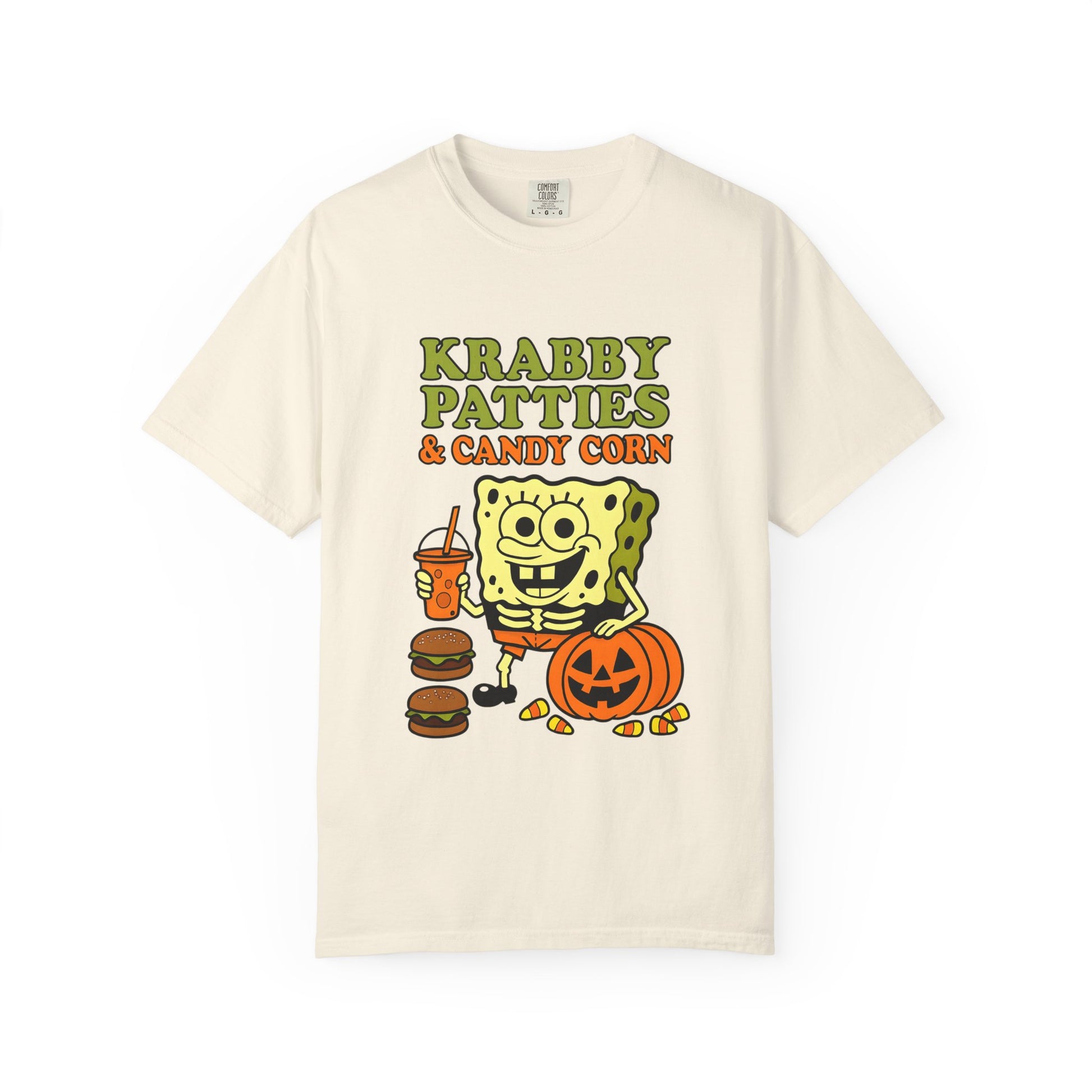 Introducing a vibrant Unisex Garment-Dyed T-shirt that brings a whimsical touch to your wardrobe. The playful design featuring 'Krabby Patties & Candy Corn' adds a fun, festive vibe, perfect for fans of animated classics. Made with soft, garment-dyed fabric, this shirt feels great against the skin, making it ideal for casual outings or cozy nights in. Whether you're celebrating Halloween, attending a themed party, or just enjoying a laid-back day, this T-shirt fits effortlessly into your life. It's designed for all ages, especially for adult enthusiasts who appreciate comfort with a splash of nostalgia.