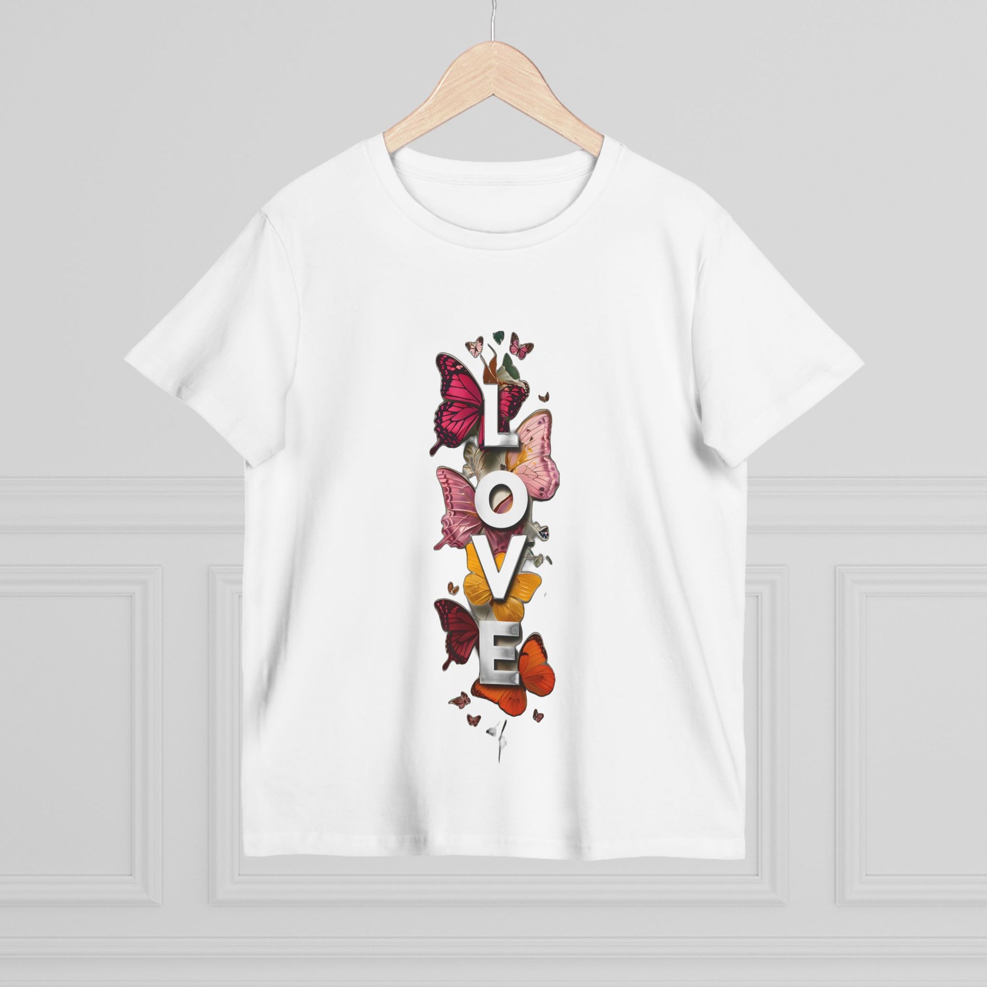 This Maple Tee features a Valentines Day design, perfect for the upcoming holiday. The cute Butterfly love graphic gives a fun and loving vibe, making it a great gift for her on Valentine's Day. This women's graphic shirt is relevant to those celebrating love and looking for a unique top to wear on the occasion.