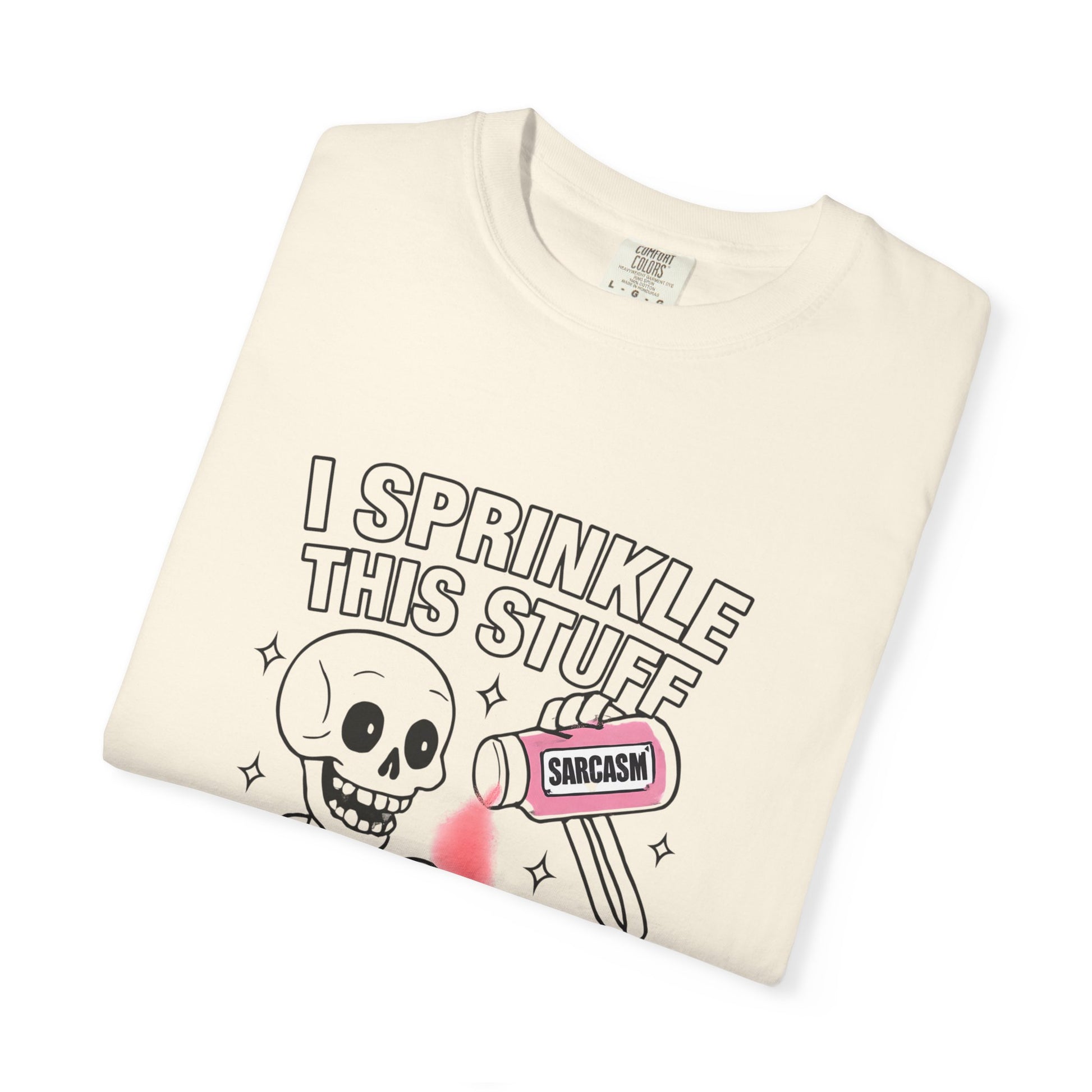 A fun and humorous Halloween-themed T-shirt featuring a skeleton holding a jar of sarcasm. This shirt exudes a playful and witty vibe, perfect for those who love to add a touch of humor to their wardrobe. Ideal for Halloween parties, trick-or-treating, or for anyone who enjoys celebrating the spooky season.