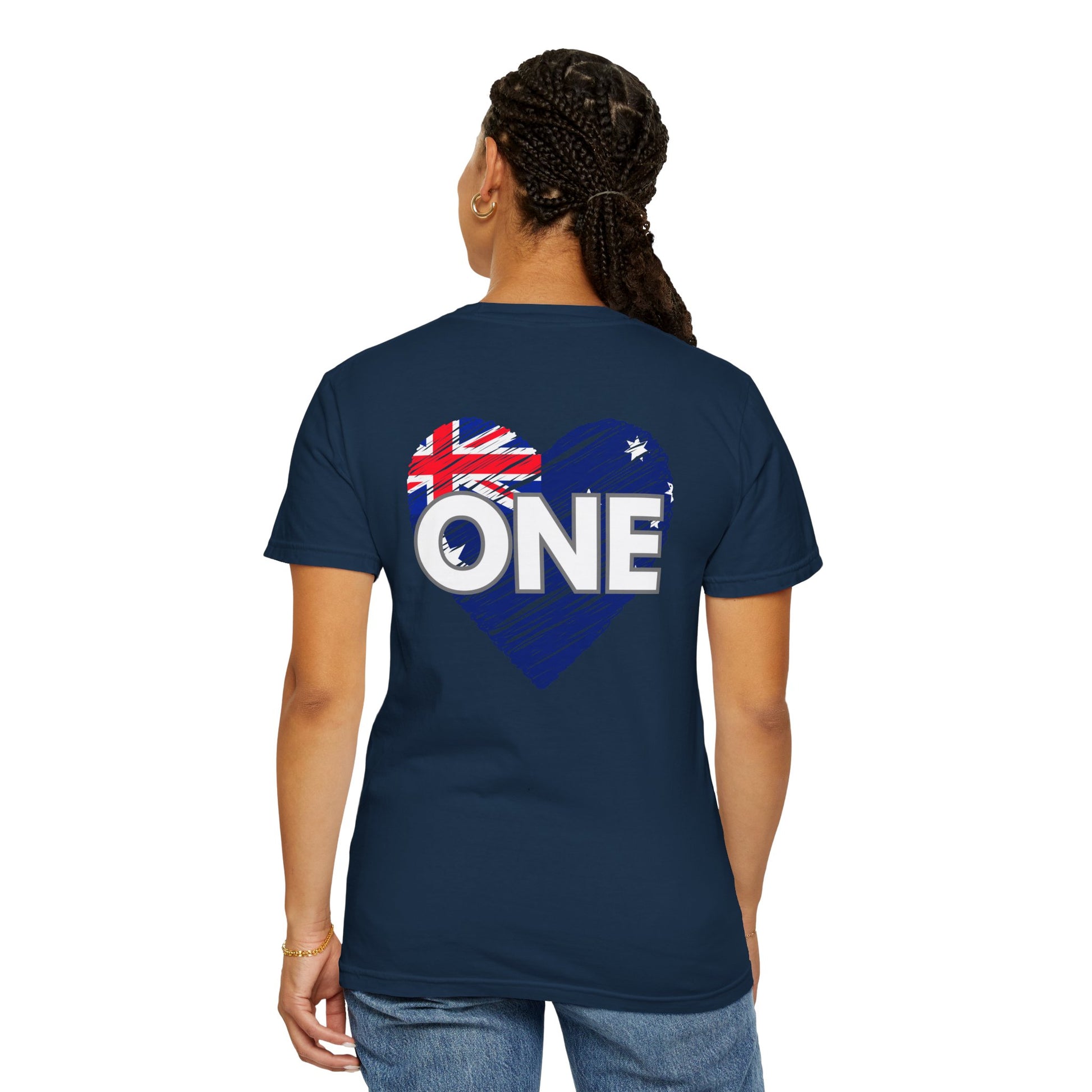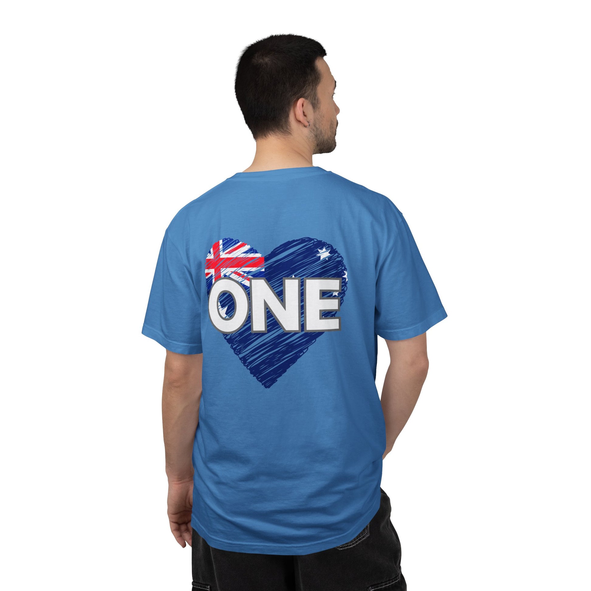Unisex ONE Together Heart T-Shirt — "We Are All In This Together" Front Text, Australian Flag One Back Design